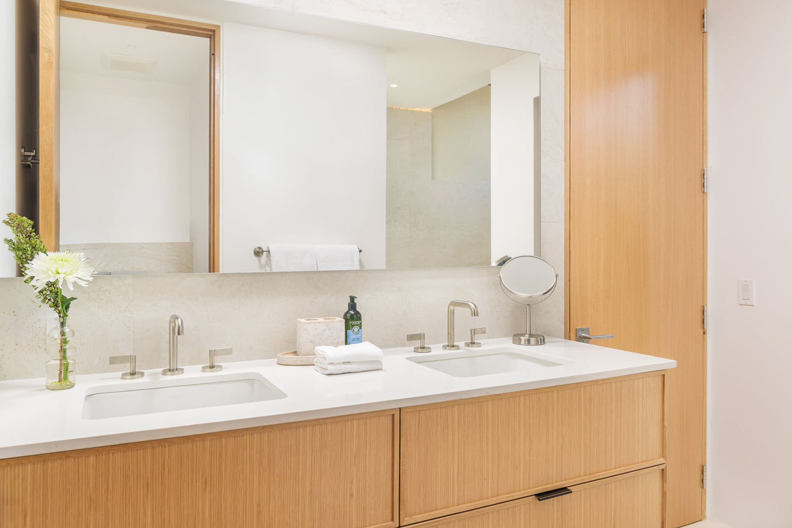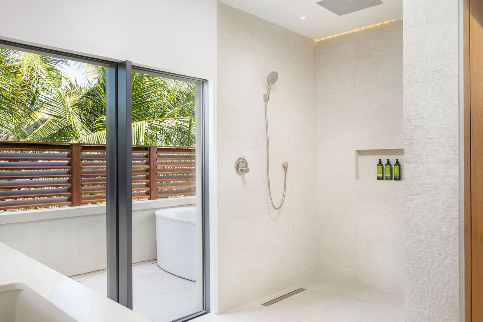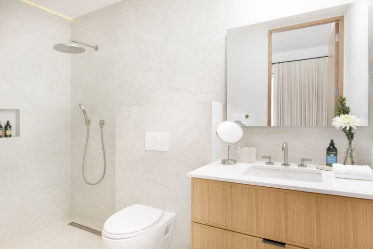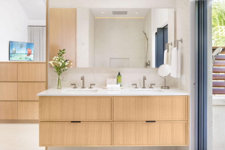 Each of the three principal suites has a king size bed, 3rd level frontal views of the pool deck, beach and ocean. There is a large 5′ cumaru wood balcony. Two of the three principal suites have outdoor showers. Each suite with blackout drapery, a large 55″ flat screen TV and large ensuite bathroom. Each suite has its own thermostat for AC control.