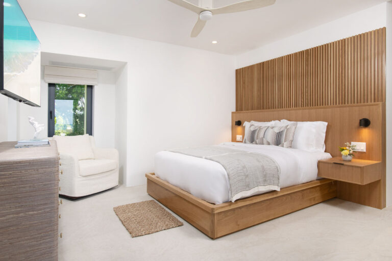 Equipped with a king size bed, views of the gardens via a private walk out door to a beach path. There is blackout drapery, a large 55″ flat screen TV and ensuite bathroom. The suite has its own thermostat for AC control.