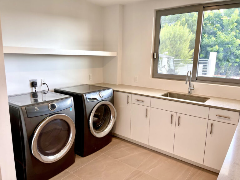 - Spacious open-plan living and kitchen area with modern kitchen appliances on the 1st level. The large kitchen and an additional workspace with laundry are ideal for private chefs.